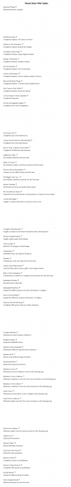 该奖杯列表与《怪物猎人:世界》的列表非常相似,仍然包含“大小金”奖杯,这也是游戏获得白金杯过程中最耗时和最费力的部分,值得一提的是,《怪物猎人:世界》的“白金率”为4.62%。以下是全奖杯列表(包含剧透):