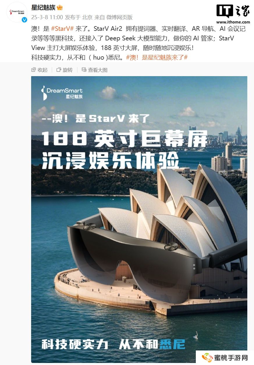本站注意到,星纪魅族官方昨日宣布 StarV 系列智能眼镜将澳大利亚悉尼亮相,其中 StarV Air2 支持提词器、实时翻译、AR 导航、AI 会议记录等功能,同时接入 Deep Seek 大模型能力。另外 StarV View主打大屏娱乐体验,可提供 188 英寸大屏。