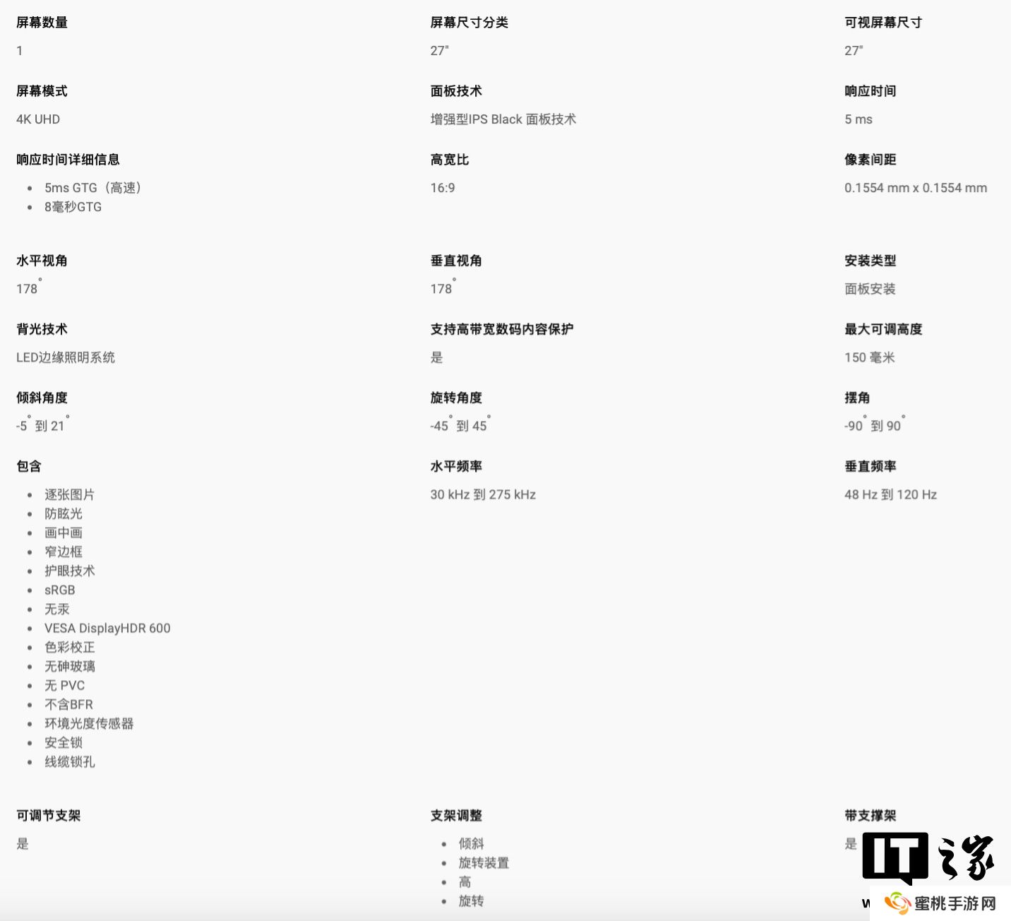 这款显示器配备3840x2160分辨率120Hz IPS Black面板,标准对比度3000:1,典型亮度450尼特,HDR峰值亮度600尼特,GtG响应速度5ms,支持 10-Bit 色彩,覆盖 99% DCI-P3 色域。
