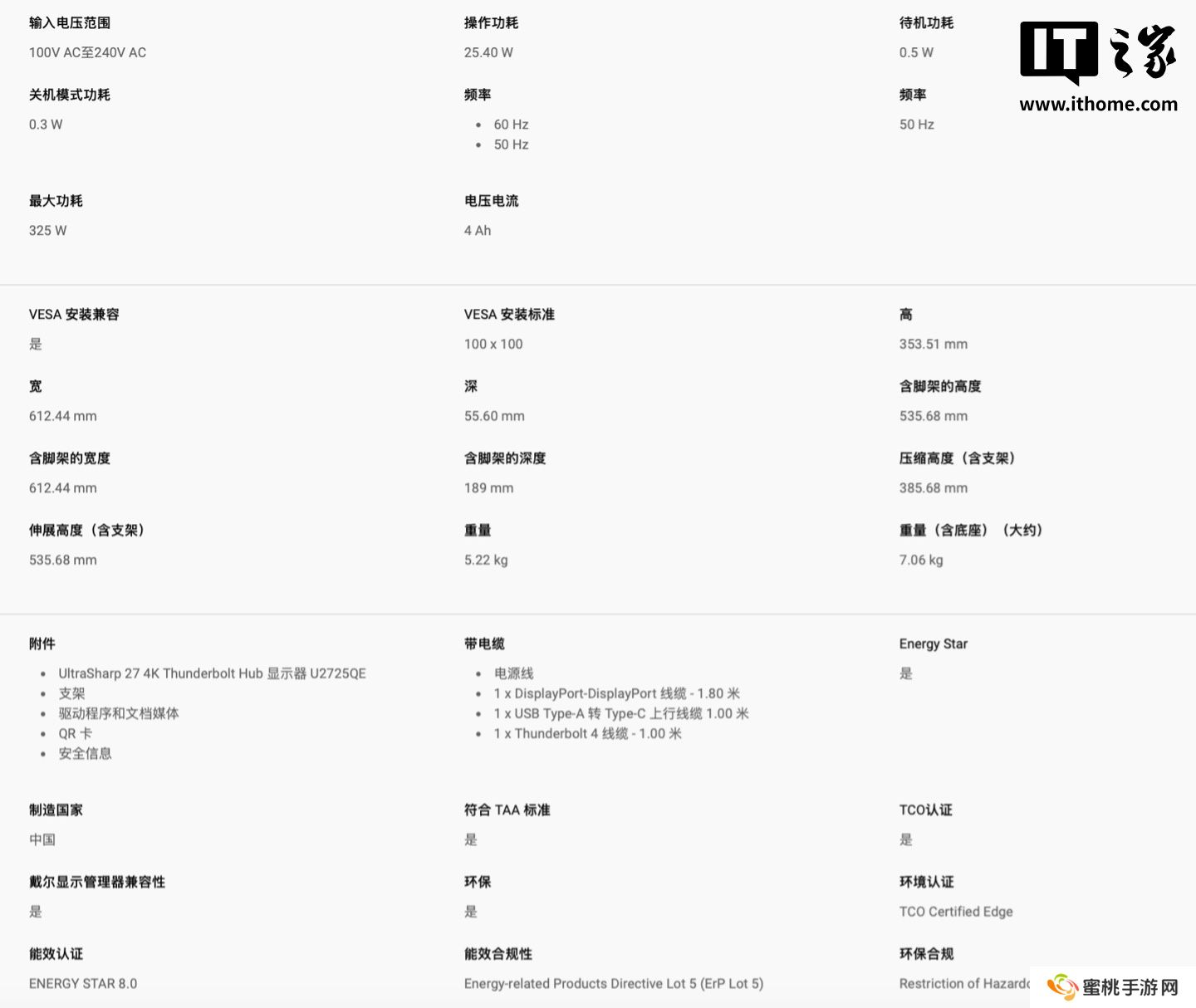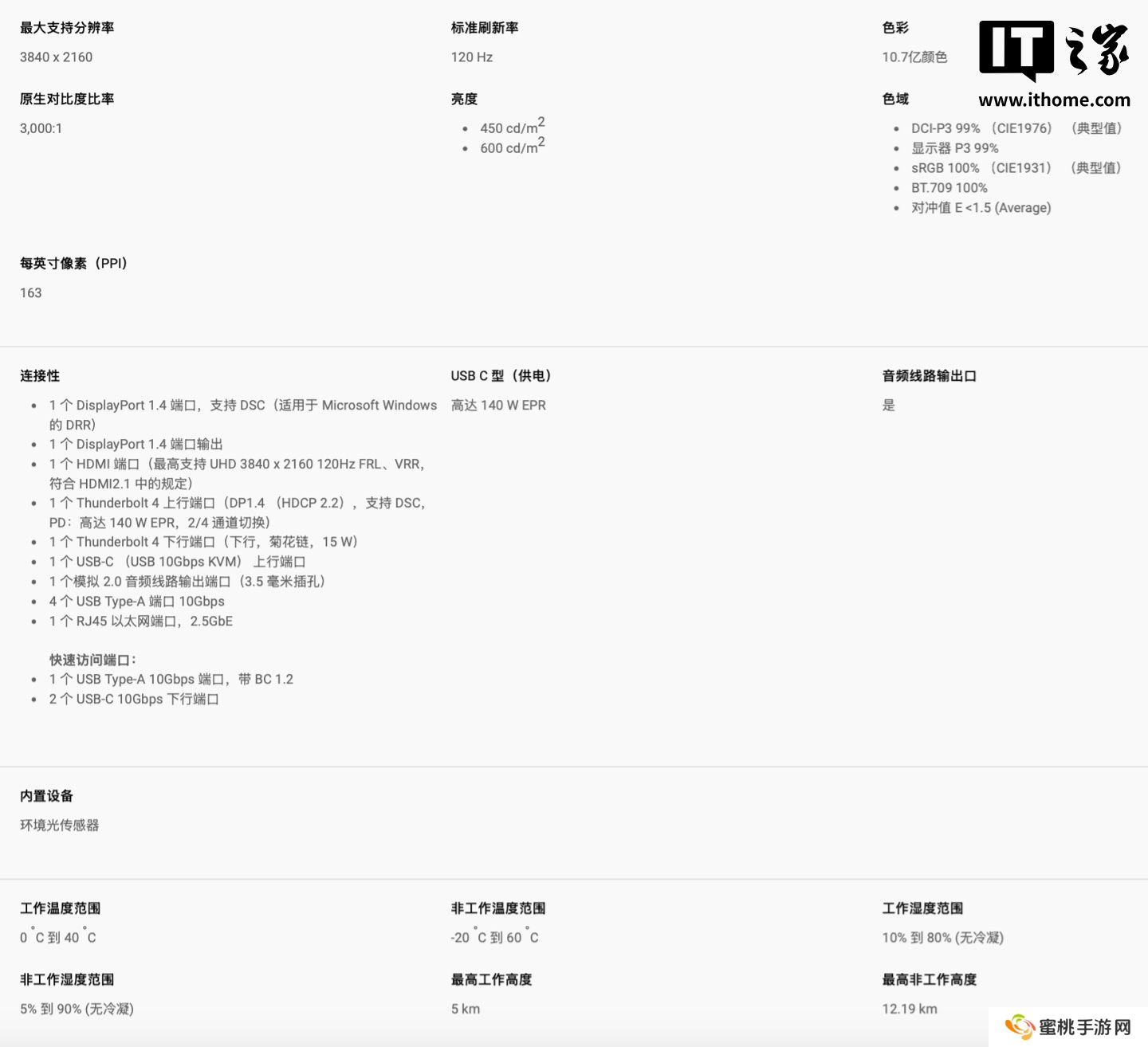 这款显示器支架支持倾斜 / 升降 / 旋转,显示器本体支持VESA 100x100mm壁挂,提供2 个 DP1.4接口(其中 1 个支持DSC)、1个HDMI 2.1接口、1个雷电4接口(上行,140W PD充电,KVM)、1个雷电4接口(下行,15W充电菊花链)、1个 USB-C接口、1 个 3.5mm 音频接口、4个 USB-A 10Gbps接口、1个 RJ 45 接口。