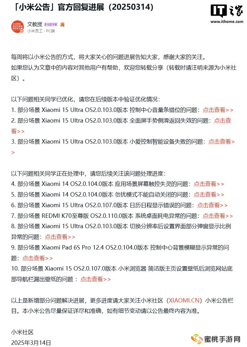 本站 3 月 16 日消息,小米官方本周(3 月 14 日)在小米社区发布公告,对小米澎湃 OS 问题处理进展进行公布,其中提到了小米 15 Ultra 手机的体验问题优化情况(澎湃 HyperOS OS 2.0.103.0 版本)。