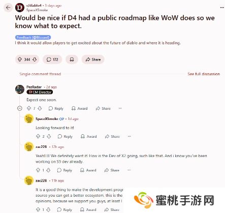 两天前,在Reddit上,一名网友希望暴雪《暗黑》开发团队也能像《魔兽》那样有自己的内容更新路线图,这样就能知道可以期待什么了。对此暴雪社区经理Adam Fletcher表示:“很快就会有”。