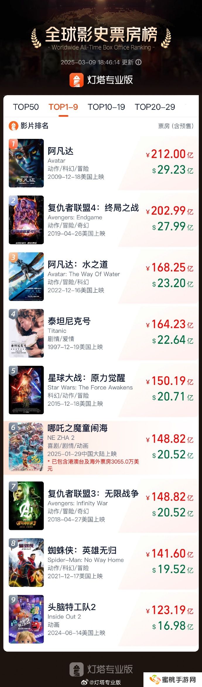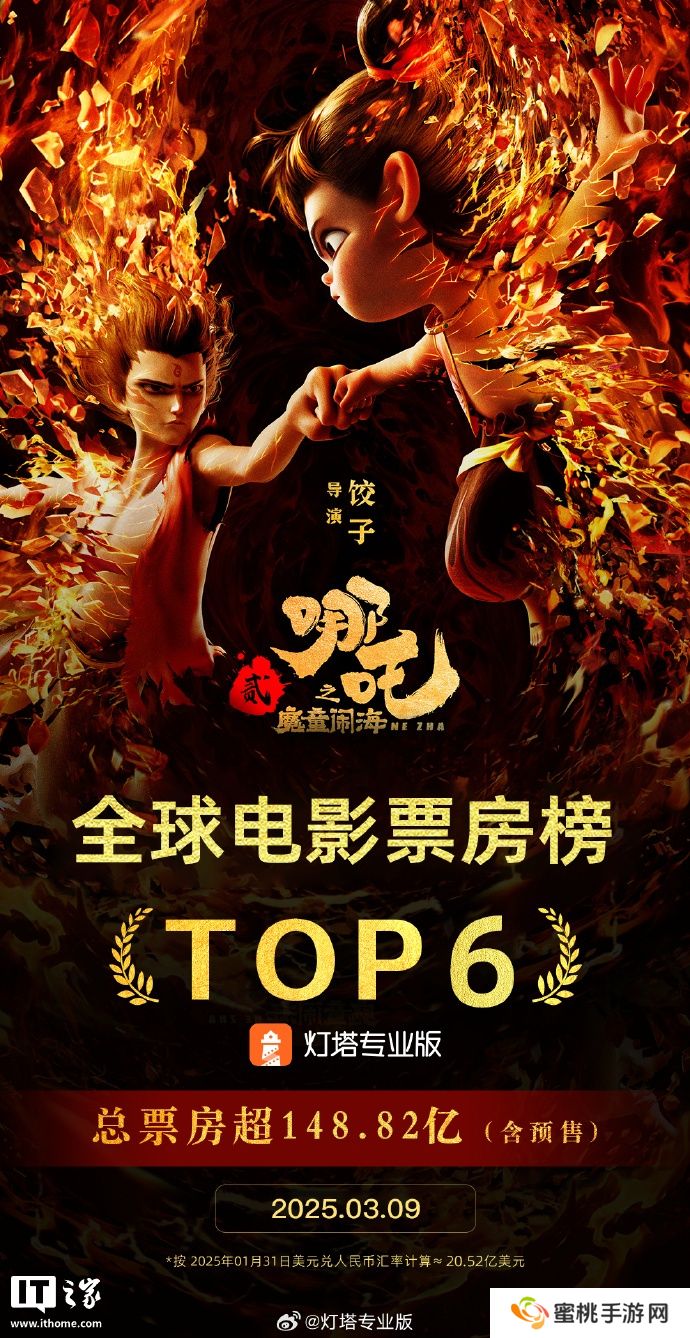 本站 3 月 9 日消息,据灯塔专业版全球票房榜,截至 3 月 9 日,影片《哪吒之魔童闹海》全球票房(含预售)突破 148.82 亿,超过《复仇者联盟 3:无限战争》,进入全球影史票房榜前 6 名。