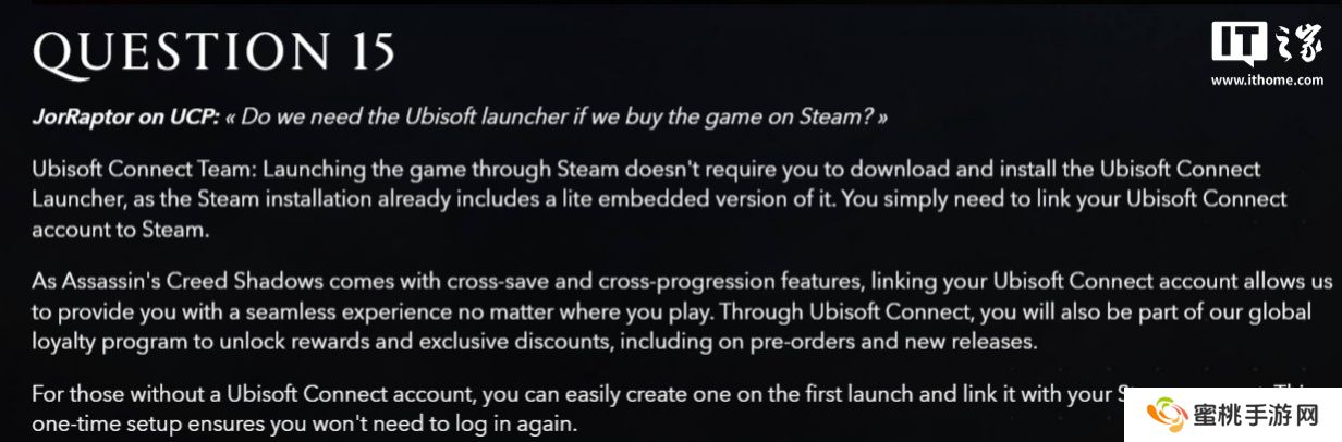 本站 3 月 13 日消息,根据育碧今年 2 月发布的《刺客信条:影》游戏官方 FAQ,育碧官方确认《刺客信条:影》Steam 版不需要下载和安装育碧自家的 Ubisoft Connect启动器。