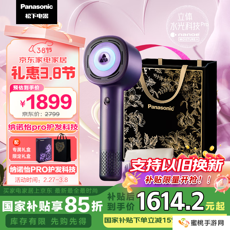 京东松下 家用高速纳米水离子吹风机 大功率速干电吹风 纳诺怡 Pro 水光离子花芯 MAX 国补后 1614.2 元直达链接