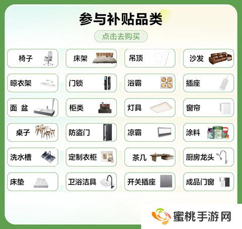 补贴品类包含:成品门窗、涂料、瓷砖、石材、木质地板、板材、吊顶、龙骨、灯具、卫浴洁具、洗水槽、门锁、开关、窗帘、床架、床垫、沙发、茶几、桌子、椅子、柜类、晾衣架、窗帘等部分。京东自营和指定店铺商品。