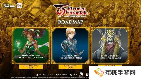 发行商505 Games和开发商Rabbit & Bear Studios宣布,《百英雄传》此前被延期的三个剧情DLC:玛丽莎之章、什恩之章和马库斯之章,将分别于2月27日、3月3日和4月3日正式推出,单款DLC售价7.99美元。《百英雄传》目前已登陆PS5、PS4、Xbox Series X|S、Xbox One、Switch、Steam、Epic和GOG。