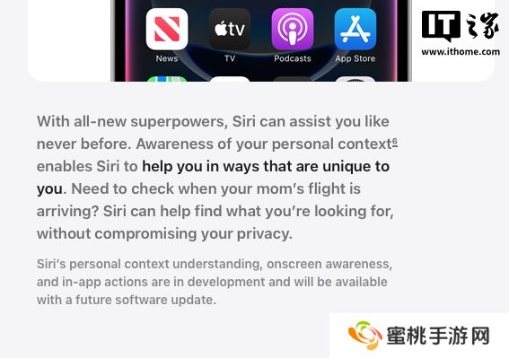 本站 3 月 12 日消息,苹果公司备受期待的 Apple Intelligence 中针对 Siri 的新功能已被无限期推迟,这些新功能原被认为是 iPhone 16 系列的一大亮点,但苹果在上周末已悄然撤下了一则展示 Siri“个人上下文”功能的 YouTube 广告。如今,苹果在其官网的 iPhone 营销页面上新增了一则免责声明,针对尚未发布的 Siri 功能进行了说明。