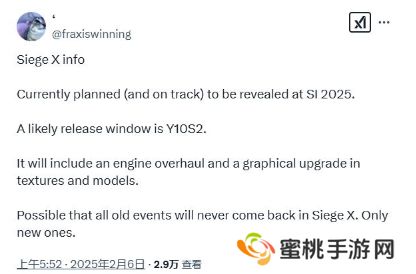 根据《彩虹六号:围攻》玩家社区知名爆料人fraxiswinning的最新推文声称,育碧计划在《彩虹六号:围攻》2025年Six Invitational国际邀请赛上公布续作《彩虹六号:围攻2》(据称该作的名称为《彩虹六号:围攻X》),该赛事将于2025年2月14日至2月16日举行,这是《彩虹六号:围攻》一年中最大的赛事,育碧通常会在活动上公布游戏的下一年更新计划。