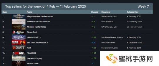 日前,Steam平台公布了2025年第7周的周销榜排名。本期榜单涌现了许多新作,其中《天国:拯救2》首次蝉联了周销榜冠军。另有《文明7》以及《怪物猎人 荒野》这两款预购游戏,攀上了榜单的前三名。