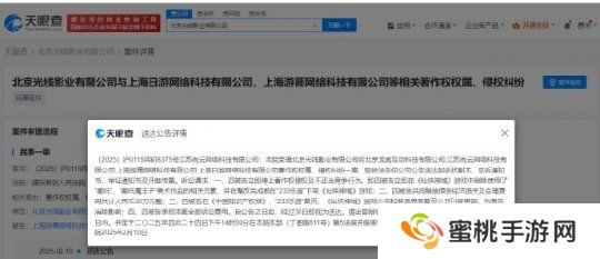 天眼查App显示,浦东新区人民法院向江苏尚云网络科技有限公司公告送达北京光线影业有限公司诉北京龙威互动科技有限公司、江苏尚云网络科技有限公司、上海游雁网络科技有限公司、上海日游网络科技有限公司著作权权属、侵权纠纷案件起诉状副本、开庭传票等。