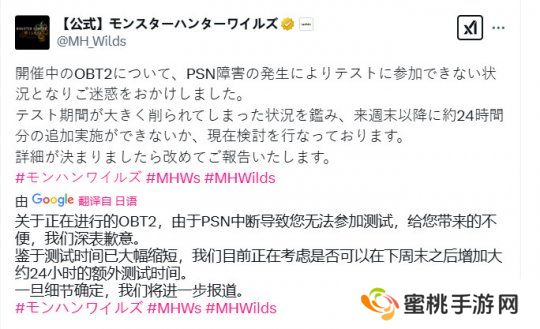 《怪物猎人》官方X上宣布,《怪物猎人:荒野》第二次BETA公测因为PlayStation Network服务发生故障而导致许多PS5玩家无法参加。由于测试时间大幅缩短,因此目前正在研拟于追加约24小时的测试时间。详情将于确定后另行公告。