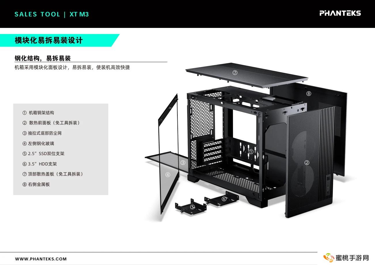 XT M3 三维宽深高 235×445×372 (mm),容积 38.9 升。其采用电源前上置结构,整体为模块化易拆装设计,支持背插主板,右侧面板电源对应位置留有进风散热孔,底部配备抽拉式防尘网,标配显卡支架。
