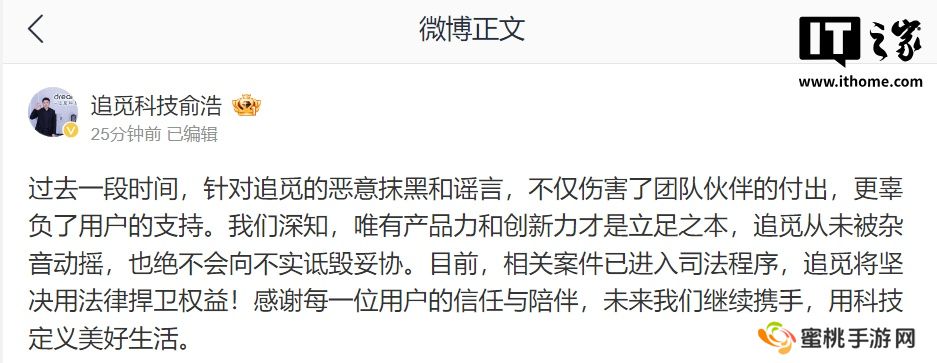 对此,追觅科技创始人兼 CEO 俞浩回应表示,“过去一段时间,针对追觅的恶意抹黑和谣言,不仅伤害了团队伙伴的付出,更辜负了用户的支持。我们深知,唯有产品力和创新力才是立足之本,追觅从未被杂音动摇,也绝不会向不实诋毁妥协。目前,相关案件已进入司法程序,追觅将坚决用法律捍卫权益!感谢每一位用户的信任与陪伴,未来我们继续携手,用科技定义美好生活。”