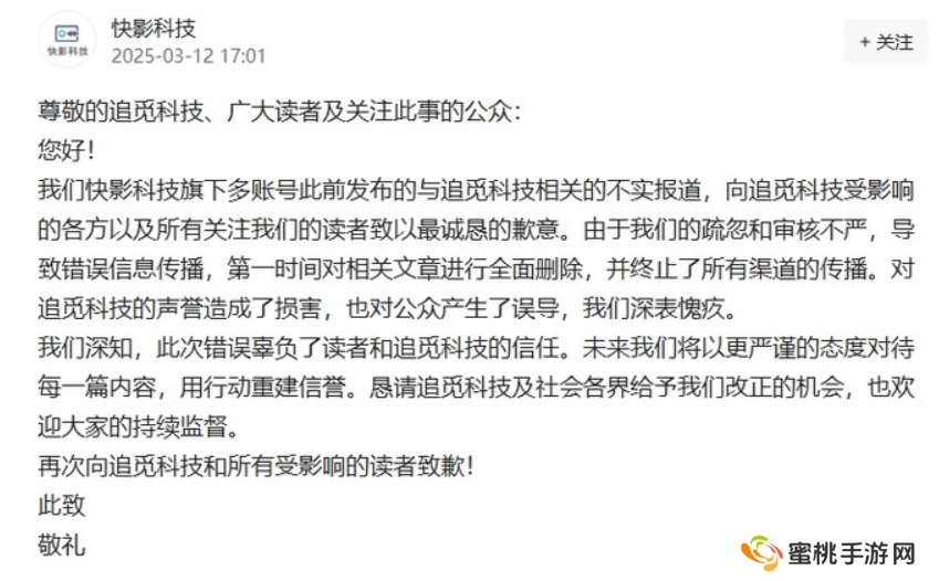 本站 3 月 12 日消息,快影科技官方账号今日晚间发布了一则《致追觅科技公开致歉声明》公告,就旗下多账号此前发布与追觅科技相关的不实报道,向追觅科技受影响的各方以及所有关注快影科技的读者致以最诚恳的歉意。