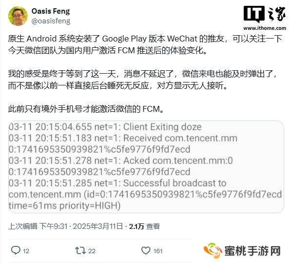 他表示:“原生安卓系统安装了谷歌 Play 版本 WeChat 的推友,可以关注一下今天微信团队为国内用户激活 FCM 推送后的体验变化。”并提醒此前只有境外手机号才能激活微信的 FCM。这位开发者在群聊中表示:“游说微信团队半年多后,终于迎来转机了。”他说:“我的感受是终于等到了这一天,消息不延迟了,微信来电也能及时弹出了,而不是像以前一样直接后台睡死无反应,对方显示无人接听。”