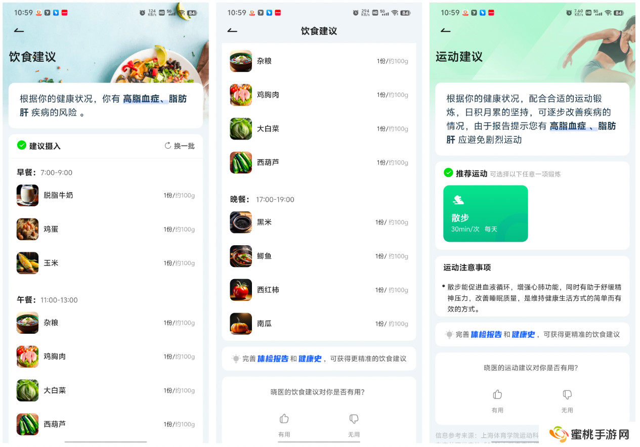 不仅如此,讯飞晓医还会根据你填写的健康史信息主动帮你生成一份饮食建议,比如小编有高脂血症、脂肪肝,它就帮我生成了对应的健康饮食计划,早餐、午餐、晚餐适合吃什么都安排得好好的。当然,除了饮食计划,讯飞晓医还可以给你提供对应的运动建议,包括适合的运动、运动中需要注意的事项等等。