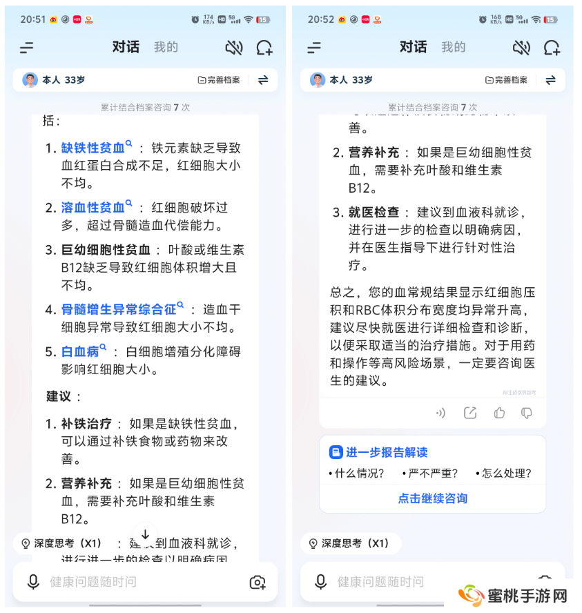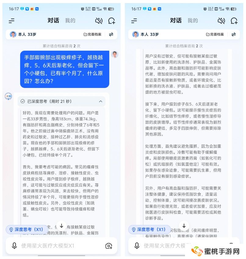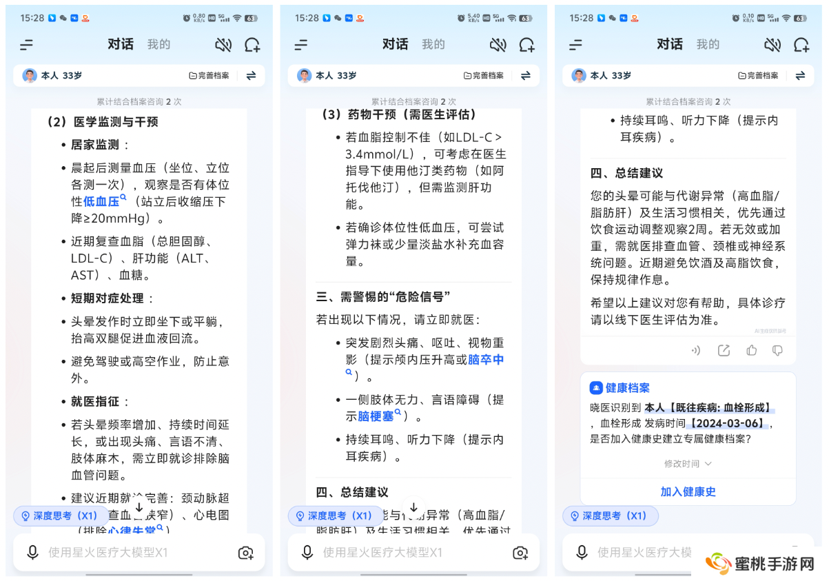 整体来说,如果说开启星火医疗大模型 X1 之前的讯飞晓医是一个知识渊博的人在根据现有的资料为你答疑解惑,那么开启大模型 X1 之后的讯飞晓医则更像是一个真实的私人医生在根据对你的了解来分析病症、给出健康管理的建议。