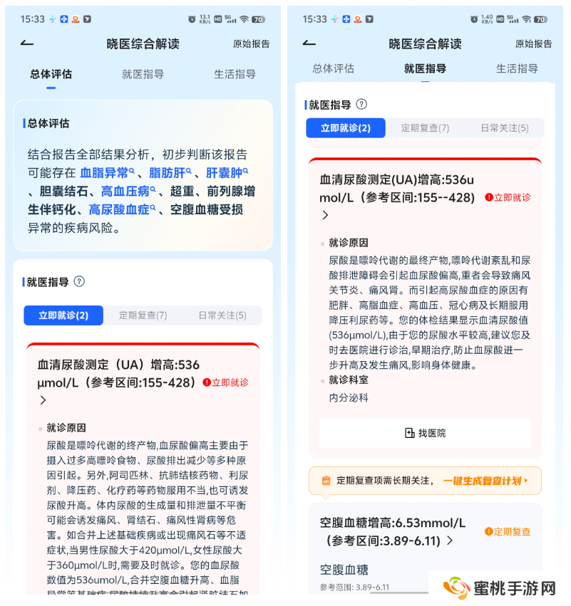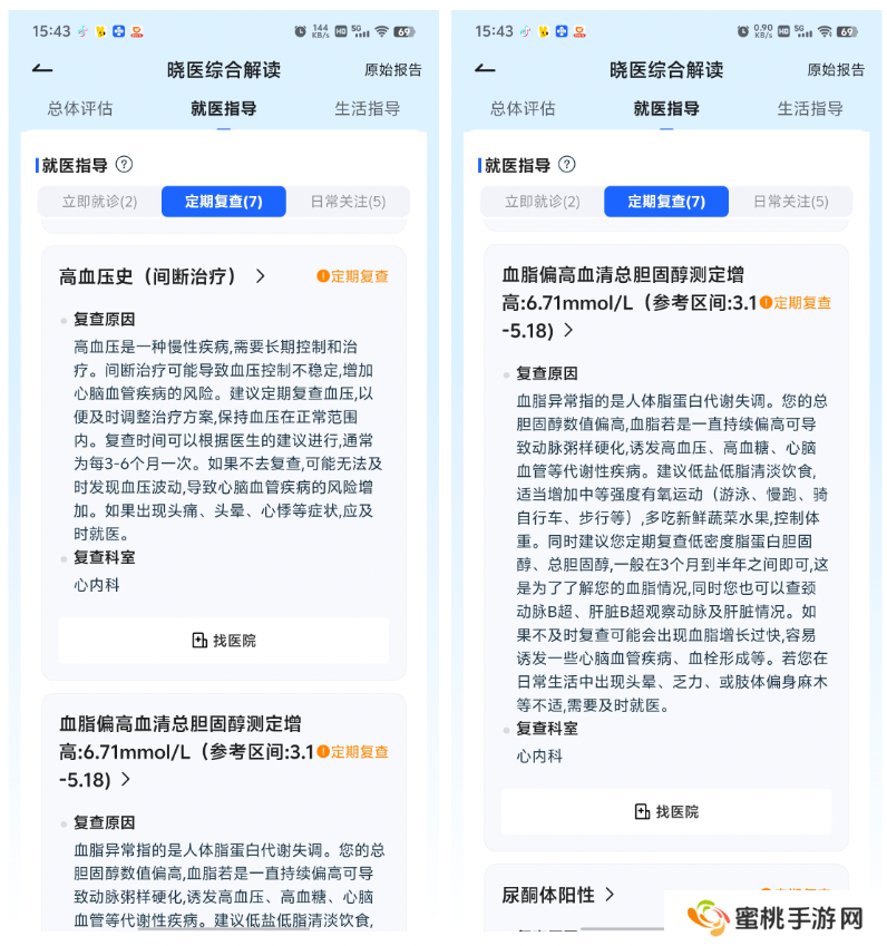 解读完成后,可以看到讯飞晓医给出的解读内容非常丰富,先是在总体评估中准确判断出报告中纯在的各项异常指标,然后又针对每一项异常指标进行医学原理解读和就医指导,在就医指导中又根据异常项目的严重情况区分了“立即就诊”、“定期复查”、“日常关注”三个类别,由于这部分内容很详细,小编截取其中片段供大家参考,不难发现呈现的方式很直观、细致,甚至指明了复查科室。