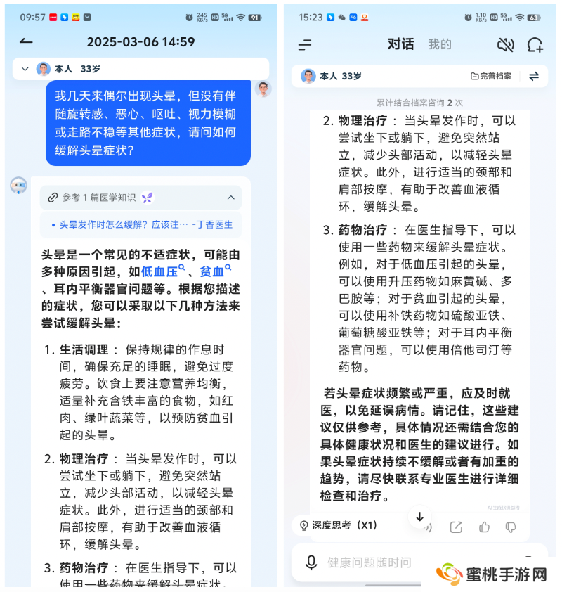 这一次我们先不开启大模型 X1,可以看到晓医主要是参考了丁香医生的一篇医学知识,提示头晕可能是由低血压、贫血、耳内平衡器官等问题造成,同时结合我描述的病症给出了生活调理、物理治疗和药物治疗三方面的改善建议。可以说具有一定的参考价值。