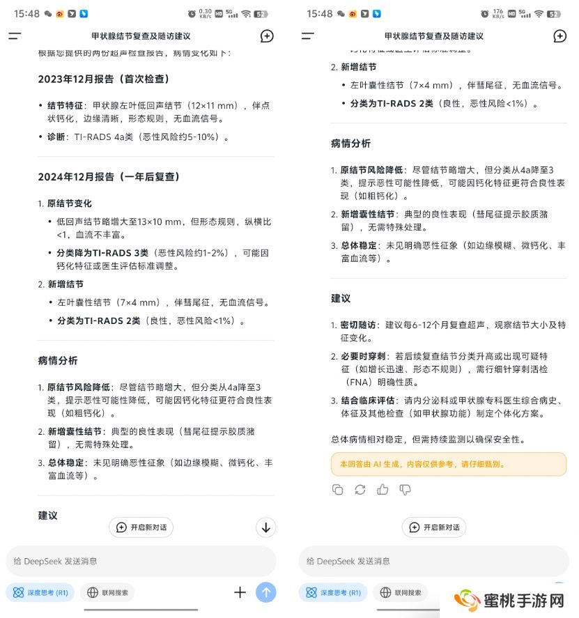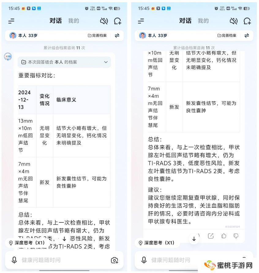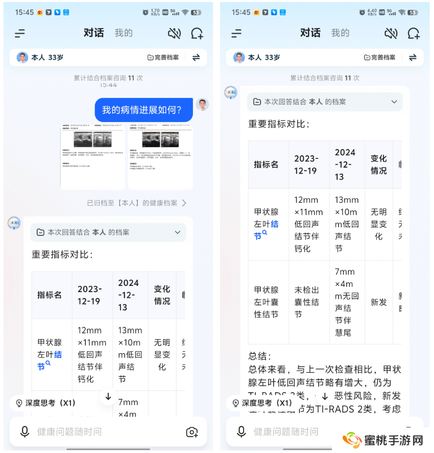 最后,小编上传了两年间不同时间拍摄的两张甲状腺彩超报告单照片,考验大模型能否根据多报告单进行时序对比解读。