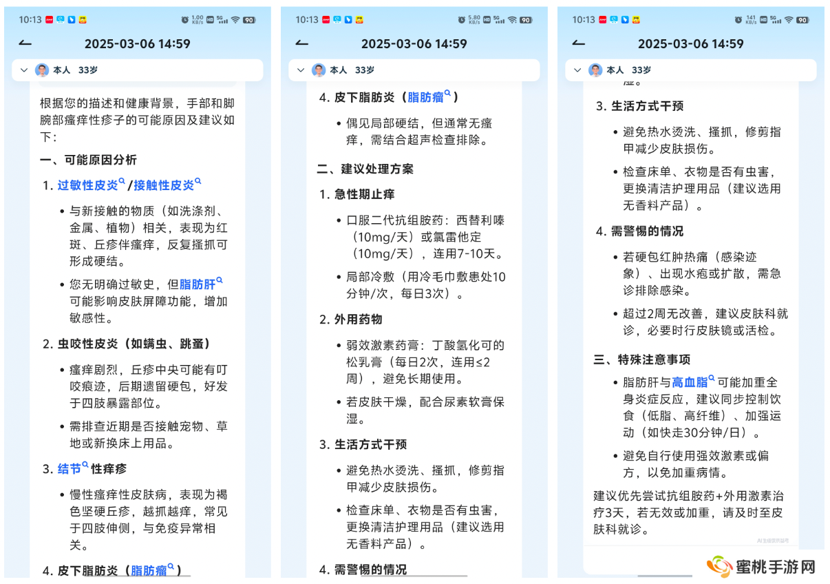 然后,小编又询问了一个问题:手部脚腕部出现极痒疹子,越挠越痒,5,6 天后渐老化,但会留下一个小硬包,已有半个月了,什么原因?怎么办?