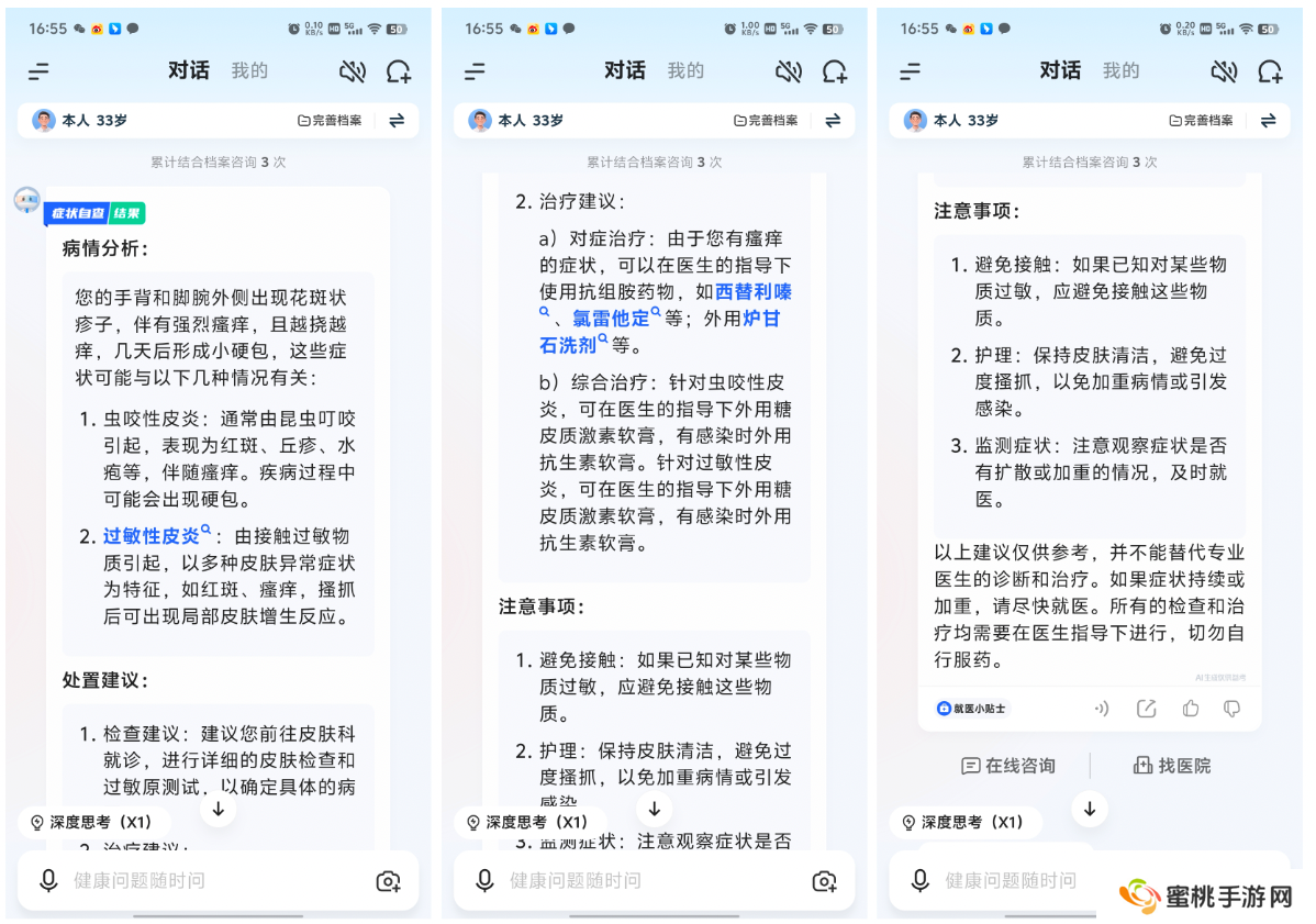 在开启大模型 X1 的情况下,你可以看到讯飞晓医在思考中是如何根据小编的病史情况和问题中描述的症状一步步排除各种因素,分析可能导致手部出现疹子的原因的,整个过程思路很是清晰,而在处理建议方面,也考虑了各种适合或者不适合的处理方式。