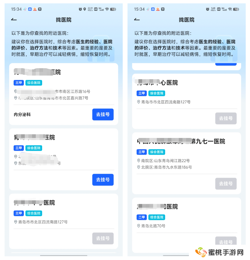 另外,讯飞晓医还直接提供了找医院的选项,点开后能够看到我所在地附近可以去的医院,小编看了一下,都是本地评价比较好的医院。