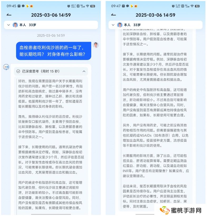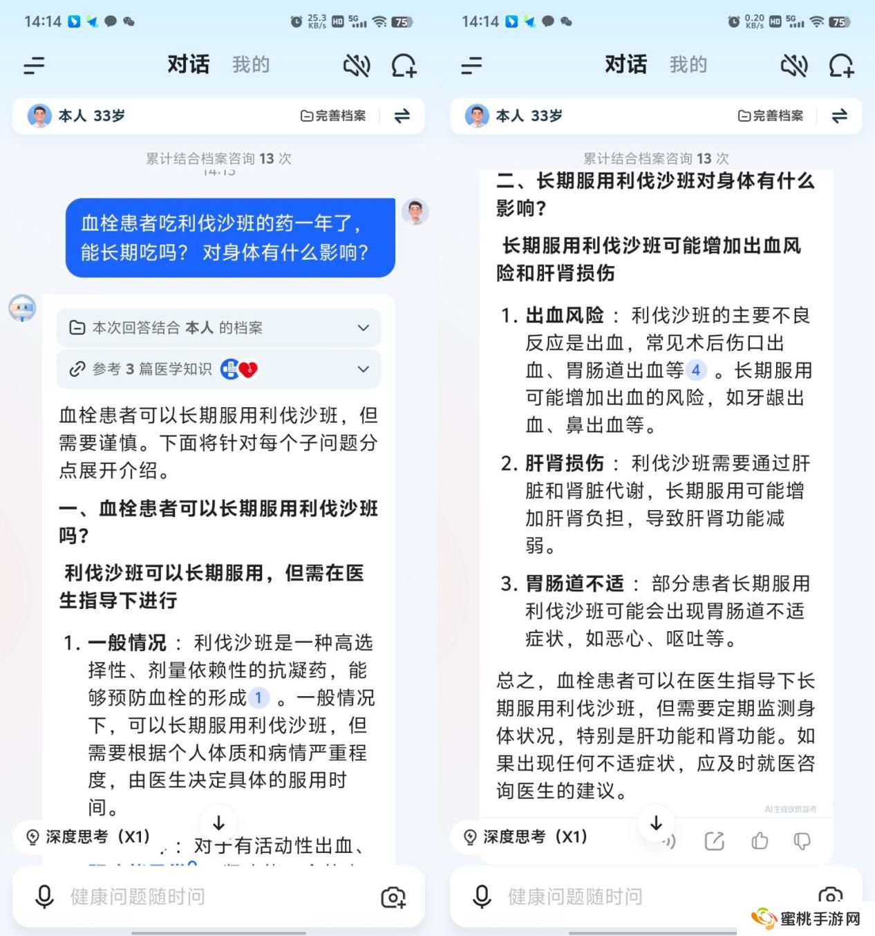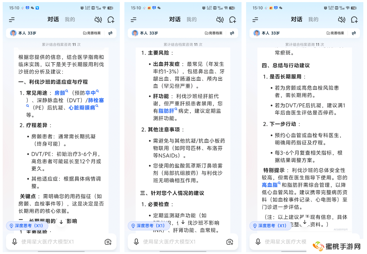 这一次,讯飞晓医并没有展现出细致的思考推理过程,而是结合我的档案和 2 篇医学知识,给出了两个方面的参考信息,首先是利伐沙班可以长期服用的特定情况,这个过程并没有特别针对我个体的情况细致分析,其次,晓医列出了长期服用利伐沙班对身体可能产生的影响,总体来说都是偏知识性的回答,尽管答案都是正确的,也具有不错的参考价值,但整体实用性、个性化方面确实不如开启大模型 X1 时的回答。