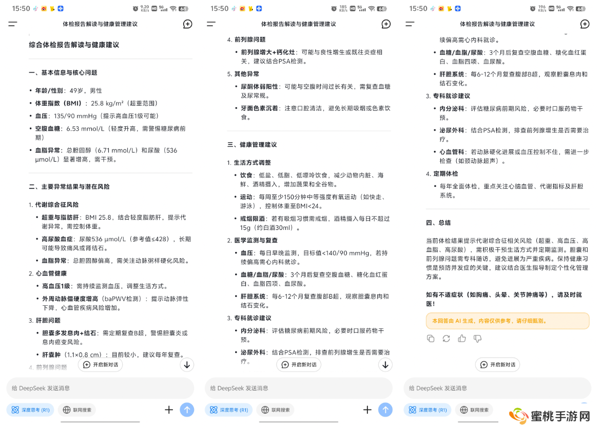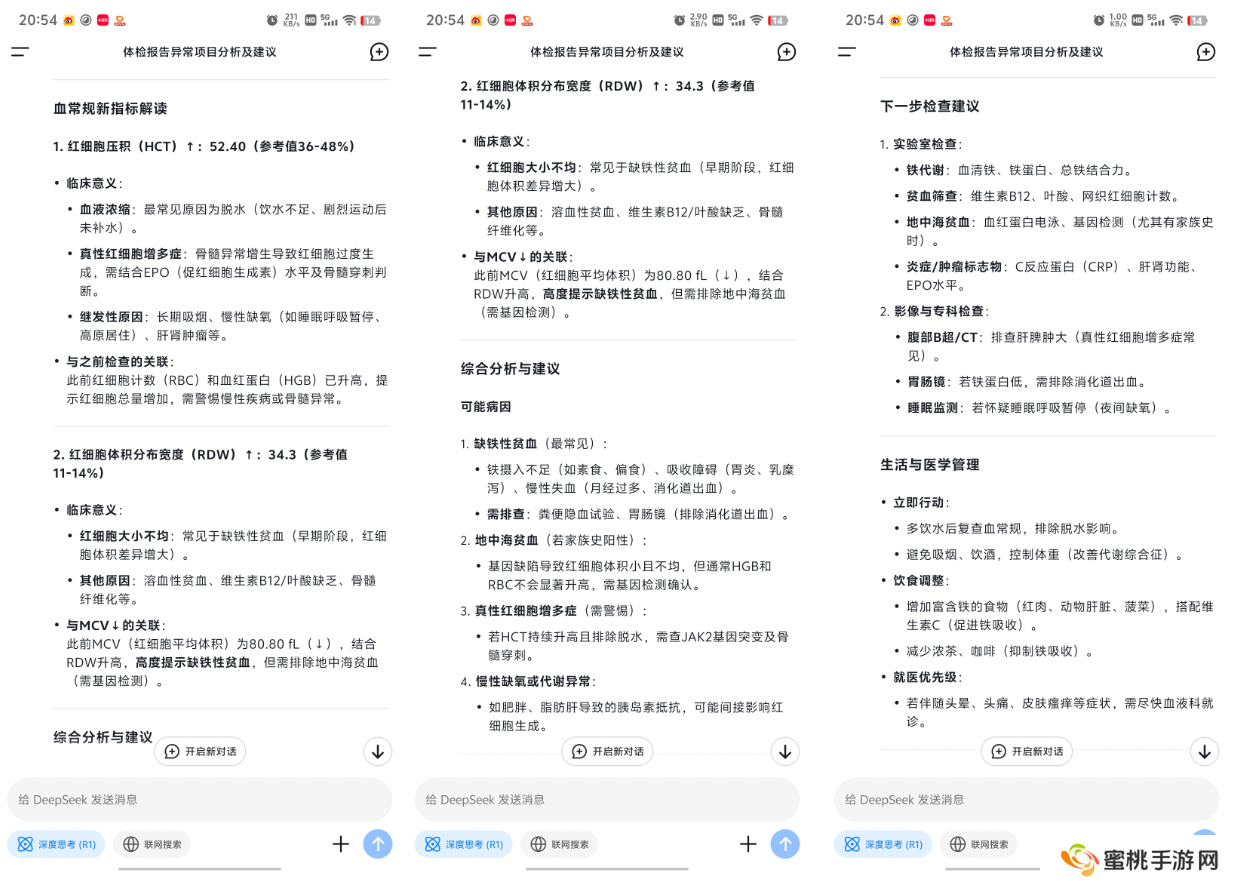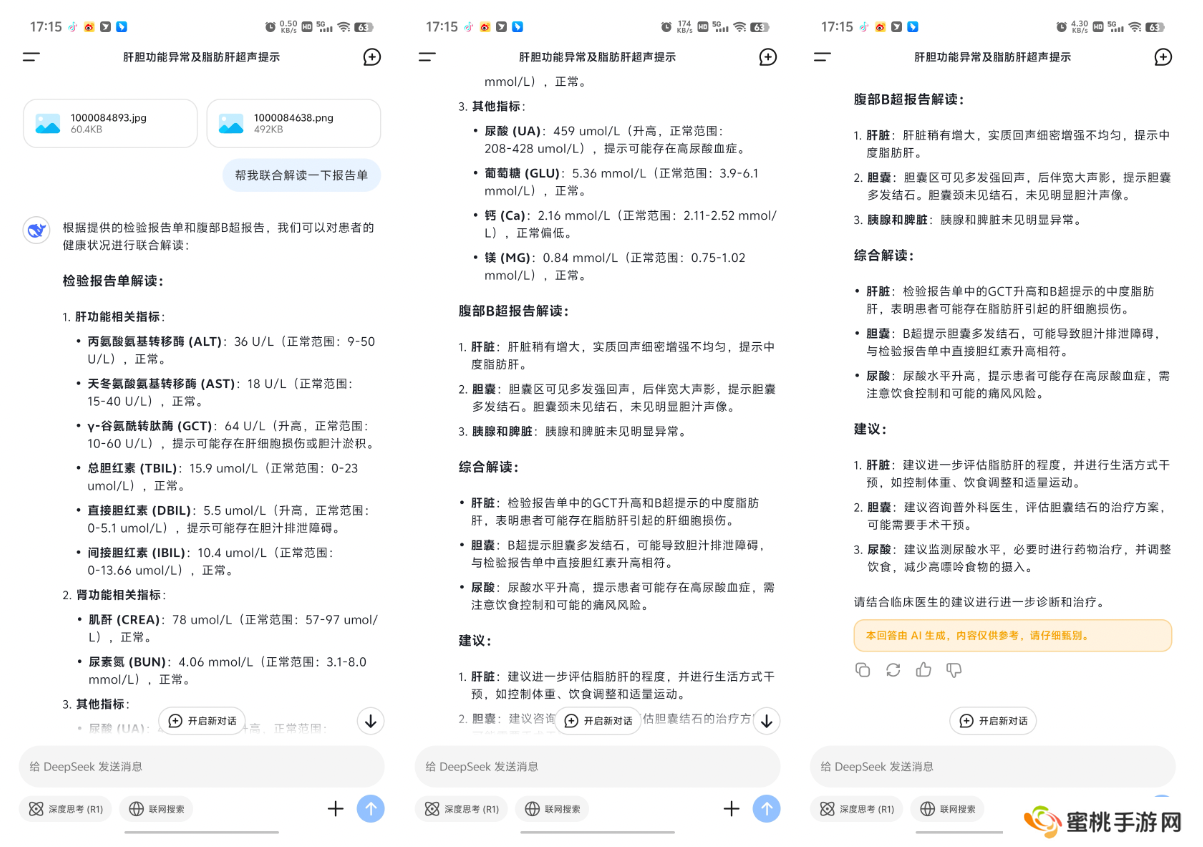 接着,小编也用 DeepSeek 做了测试,同样的问题给 DeepSeek,可以看到 DeepSeek 将正常项目和异常项目混在一起,看起来不够清晰直观,也不能结合本人的病史档案进行分析,整体来说属于比较机械的解读,虽然没有错误,但实用性稍低一些。