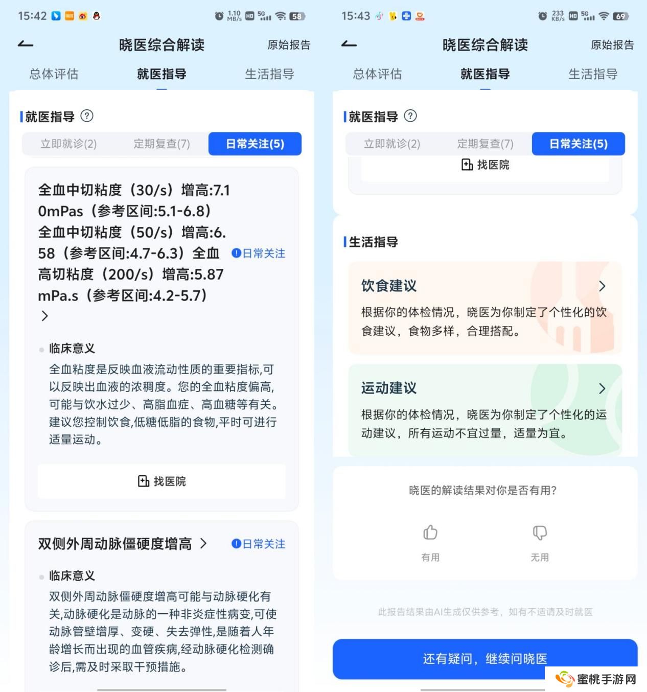 不仅如此,讯飞晓医还列出了根据这份报告的异常指标,给出了报告主体在日常生活中需要关注饮食和运动方面的建议。整体来说非常专业、详尽。