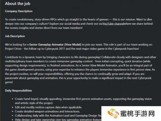 这个职位位于波士顿分部,职责是负责开发《赛博朋克2077》续作《猎户座计划》。职位描述提到,高级游戏动画师要利用专业知识,来增强玩家在第一人称视角下的沉浸式体验。动画师将负责制作“手工调制的、具有视觉吸引力、身临其境的第一人称动画资产”。将《赛博朋克2077》续作打造成CDPR下一部巨作。