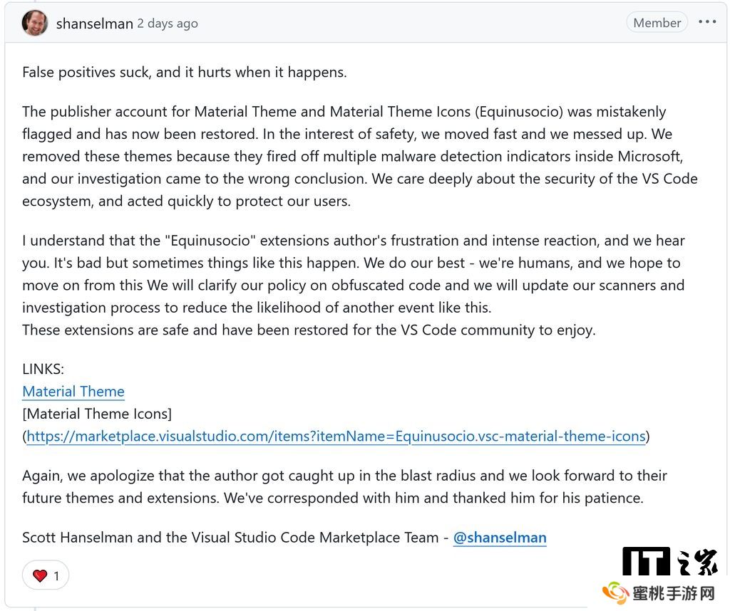 本站 3 月 14 日消息,科技媒体 NeoWin 今天(3 月 14 日)发布博文,报道称微软承认“误杀”两款热门 VS Code 扩展,微软开发者社区副总裁 Scott Hanselman 已公开道歉,并恢复了这两款扩展。