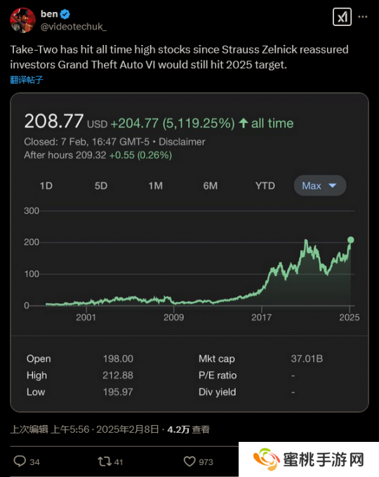 宣布《GTA6》不会延期后 Take-Two股价飙升至历史新高