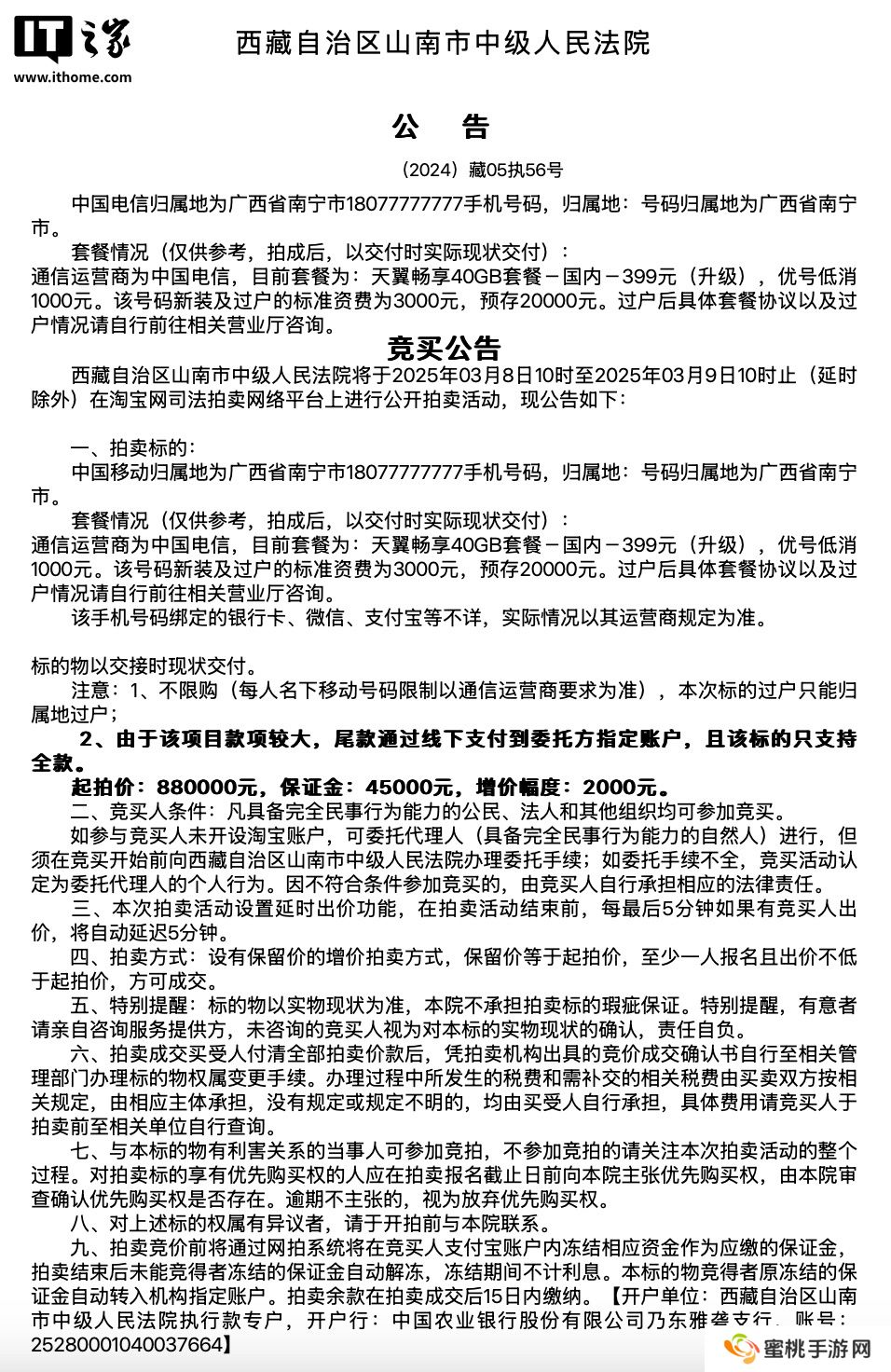 本站获悉,该号码每月最低消费为 1000 元,过户还须先预存 2 万元。竞买公告中同时载明,此次拍卖的号码仅为使用权,号码归属地为广西南宁。