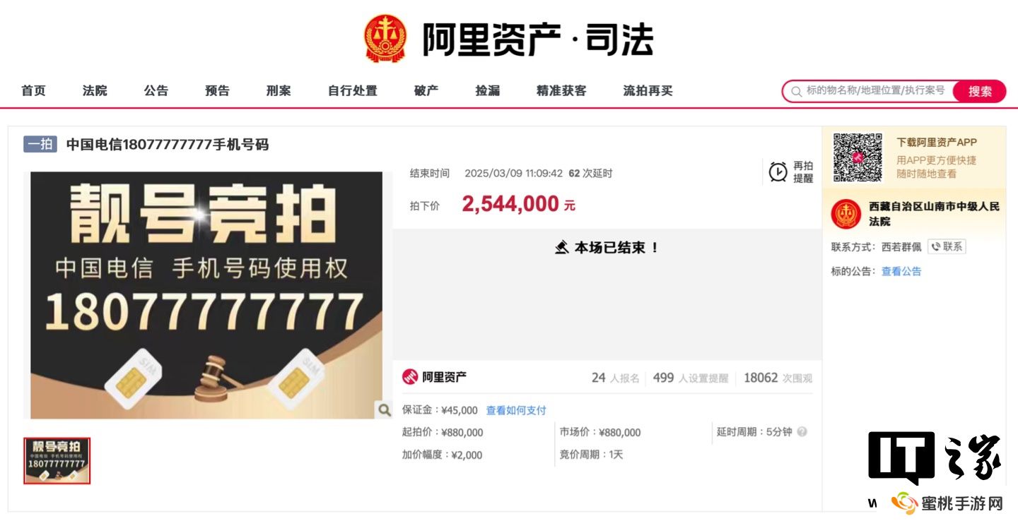 本站 3 月 9 日消息,阿里资产拍卖平台显示,现有一个尾号为77777777(8 个 7)的手机靓号“18077777777”完成拍卖,相应号码以 88 万元的高价起拍,24 名竞买人共出价 110 轮,拍卖成交价最终定格在 254.4 万元。