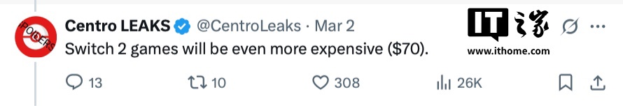 本站 3 月 9 日消息,消息源Centro LEAKS在X平台发文,透露任天堂Switch 2游戏平均定价将更高,预计普遍达到69.99 美元(本站备注:当前约 507 元人民币),相应定价将“对标”Xbox Series X|S和PS5平台3A作品。