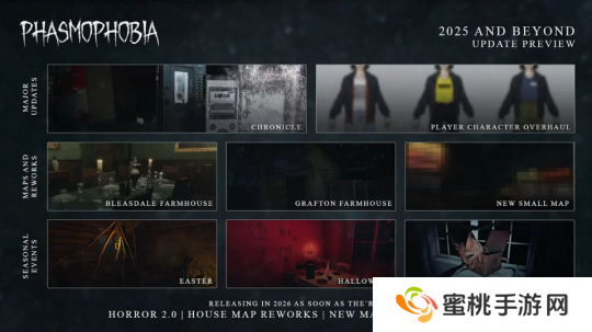 开发商 Kinetic Games 日前发布了合作恐怖游戏《恐鬼症》的 2025 年更新计划路线图。工作室通过官方网站分享了接下来的计划,包括 2 个重大更新、全新的地图,以及季节性活动。