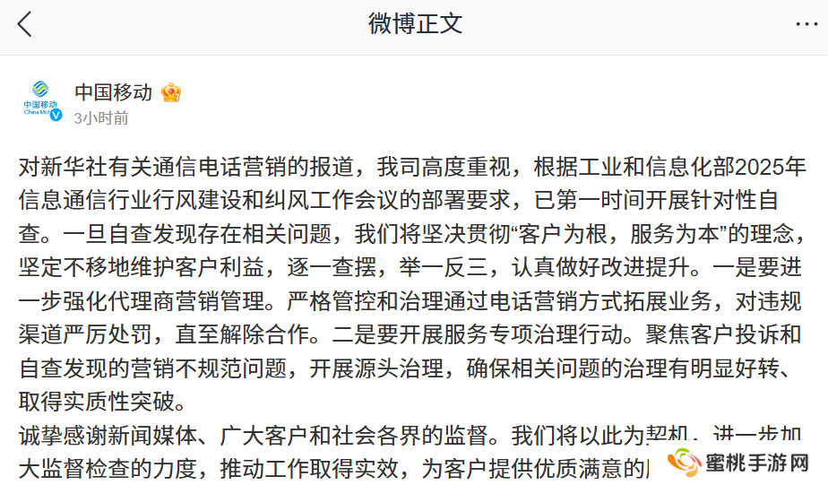 对新华社有关通信电话营销的报道,我司高度重视,根据工业和信息化部 2025 年信息通信行业行风建设和纠风工作会议的部署要求,已第一时间开展针对性自查。一旦自查发现存在相关问题,我们将坚决贯彻“客户为根,服务为本”的理念,坚定不移地维护客户利益,逐一查摆,举一反三,认真做好改进提升。一是要进一步强化代理商营销管理。严格管控和治理通过电话营销方式拓展业务,对违规渠道严厉处罚,直至解除合作。二是要开展服务专项治理行动。聚焦客户投诉和自查发现的营销不规范问题,开展源头治理,确保相关问题的治理有明显好转、取得实质性突破。