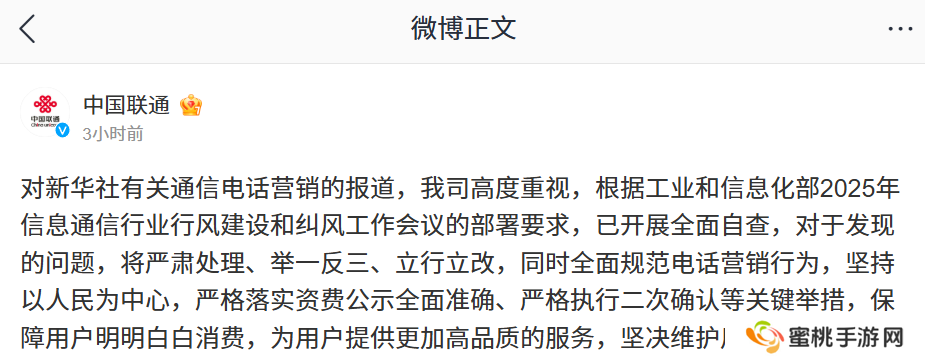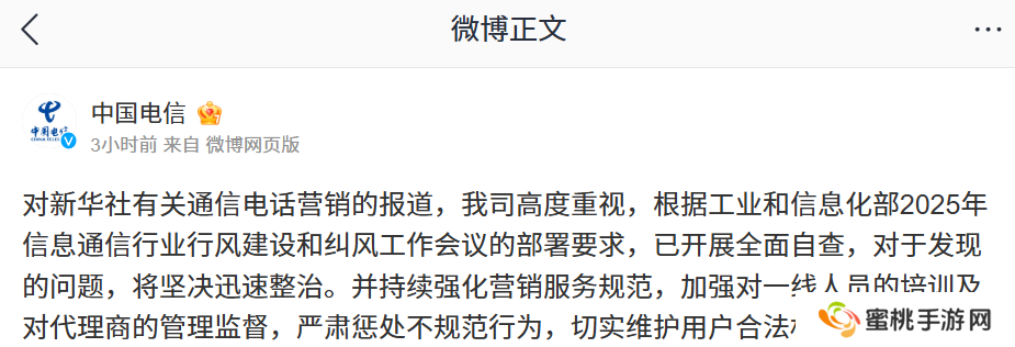 对新华社有关通信电话营销的报道,我司高度重视,根据工业和信息化部 2025 年信息通信行业行风建设和纠风工作会议的部署要求,已开展全面自查,对于发现的问题,将坚决迅速整治。并持续强化营销服务规范,加强对一线人员的培训及对代理商的管理监督,严肃惩处不规范行为,切实维护用户合法权益。