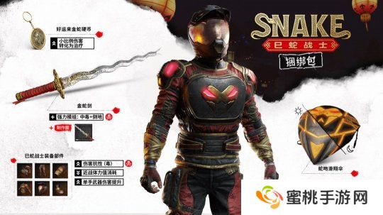玩家可通过漫游者哨站兑换全新蛇年奖励“巳蛇战士捆绑包”,内含巳蛇战士套装、金蛇剑、好运来金蛇硬币、巳蛇战士装备部件。此前的新年物品“月兔面具”“祖龙之刃”等也返场,可用代币兑换。