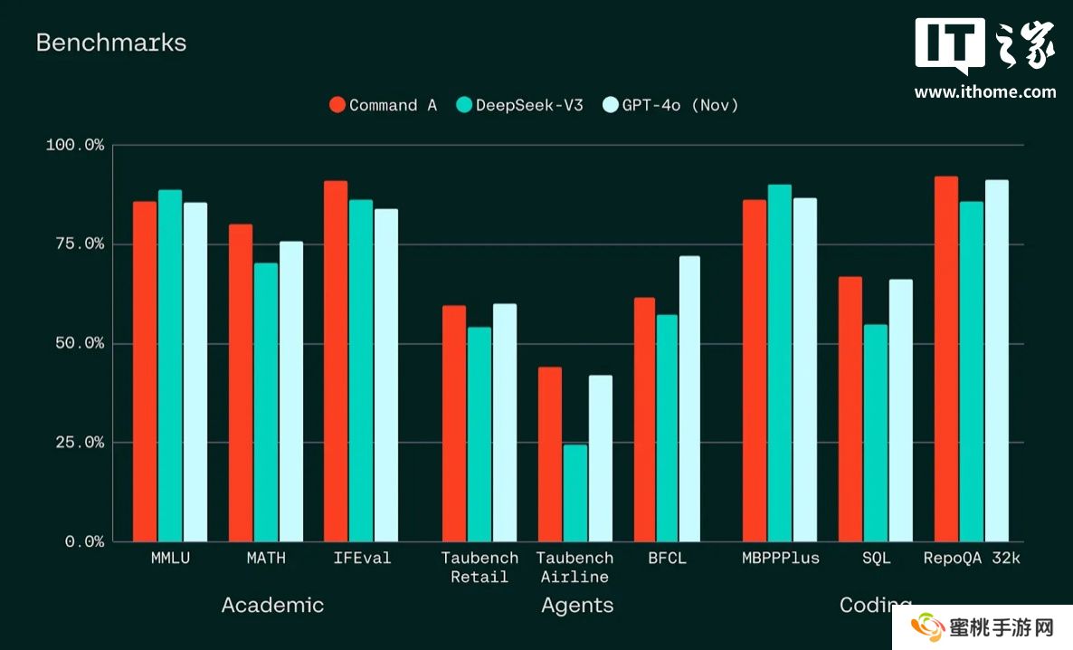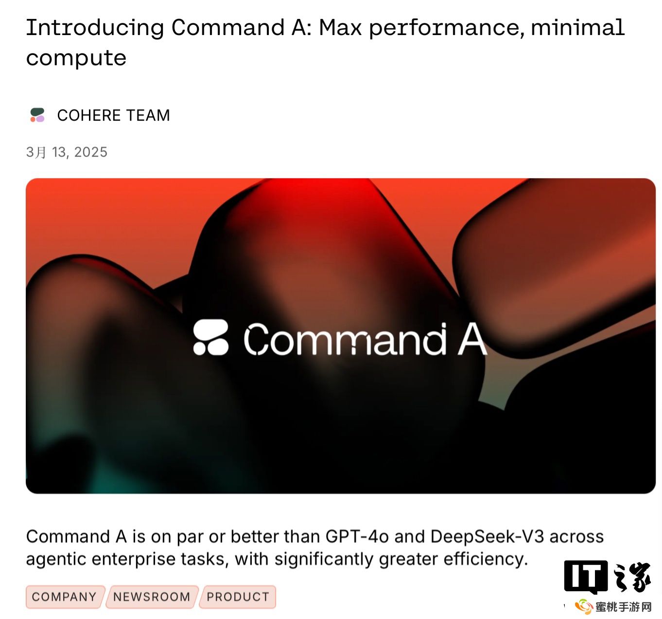 本站 3 月 14 日消息,加拿大 AI 初创公司 Cohere昨日发布了一款名为“Command A”的 AI模型,该模型主打轻量化应用,号称只需要两块英伟达 A100 或 H100 GPU 即可轻松部署,号称“表现能和 GPT-4o 相媲美”,实现“用最少的硬件发挥最大的性能”。