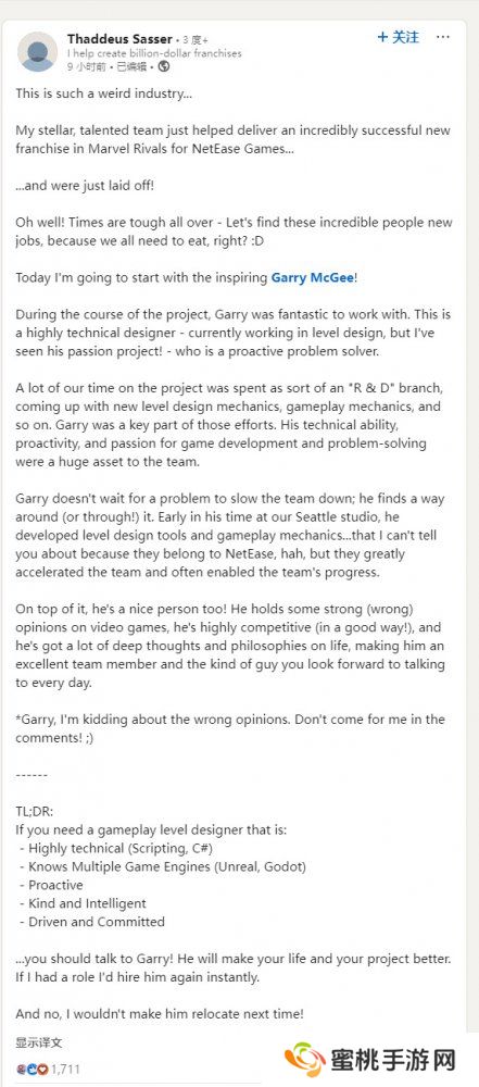 但《漫威争锋》游戏总监Thaddeus Sasser,近期却在领英上发布动态,称自己所在的整个团队被网易突然裁掉。而这则消息,也得到了西雅图团队的开发人员证实。