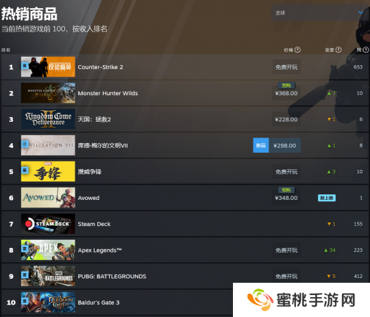 截至稿时,游戏位居 Steam 全球范围畅销榜第 6 名,美国畅销榜第 3 名。不过在国内,游戏并没有获得太多关注,排名第 36 位。全球榜登榜游戏包括了最近的热门新作,例如《文明7》、即将推出的《怪物猎人:荒野》,以及热门的持续运营游戏,例如《漫威争锋》、《Apex英雄》,以及登顶的《CS2》。