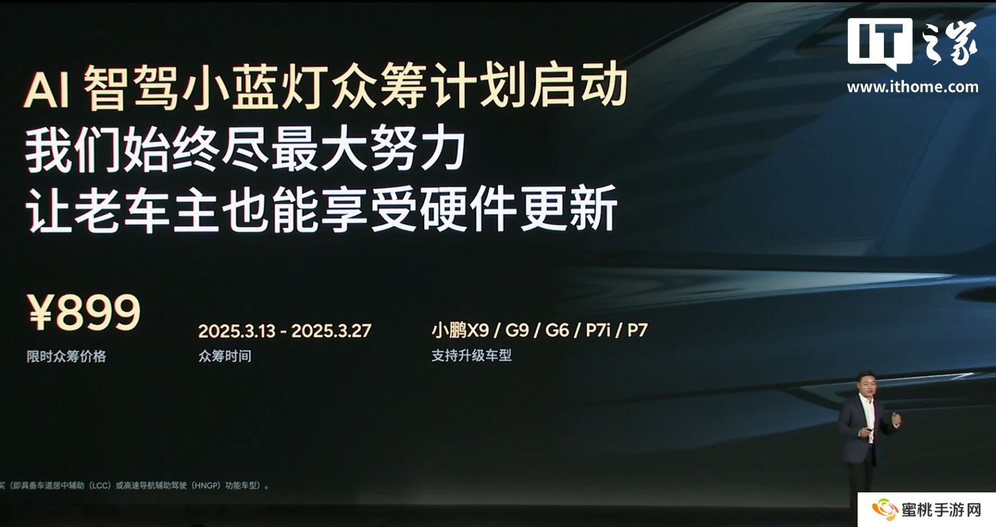 本站注意到,小鹏汽车 3 月 13 日官宣启动 AI 智驾小蓝灯众筹计划,让老车主也能用上智驾小蓝灯,限时众筹价格 899 元。