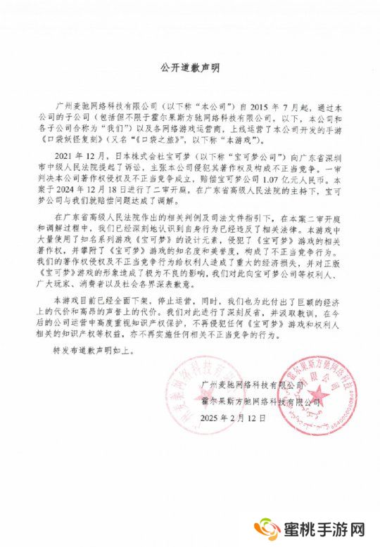 日前,手游《口袋妖怪复刻》开发商广州麦驰网络科技有限公司,因侵犯了《宝可梦》游戏的相关著作权,公开了道歉声明。声明中提到,二审开庭后广州麦驰网络科技有限公司与宝可梦公司就赔偿达成调解。