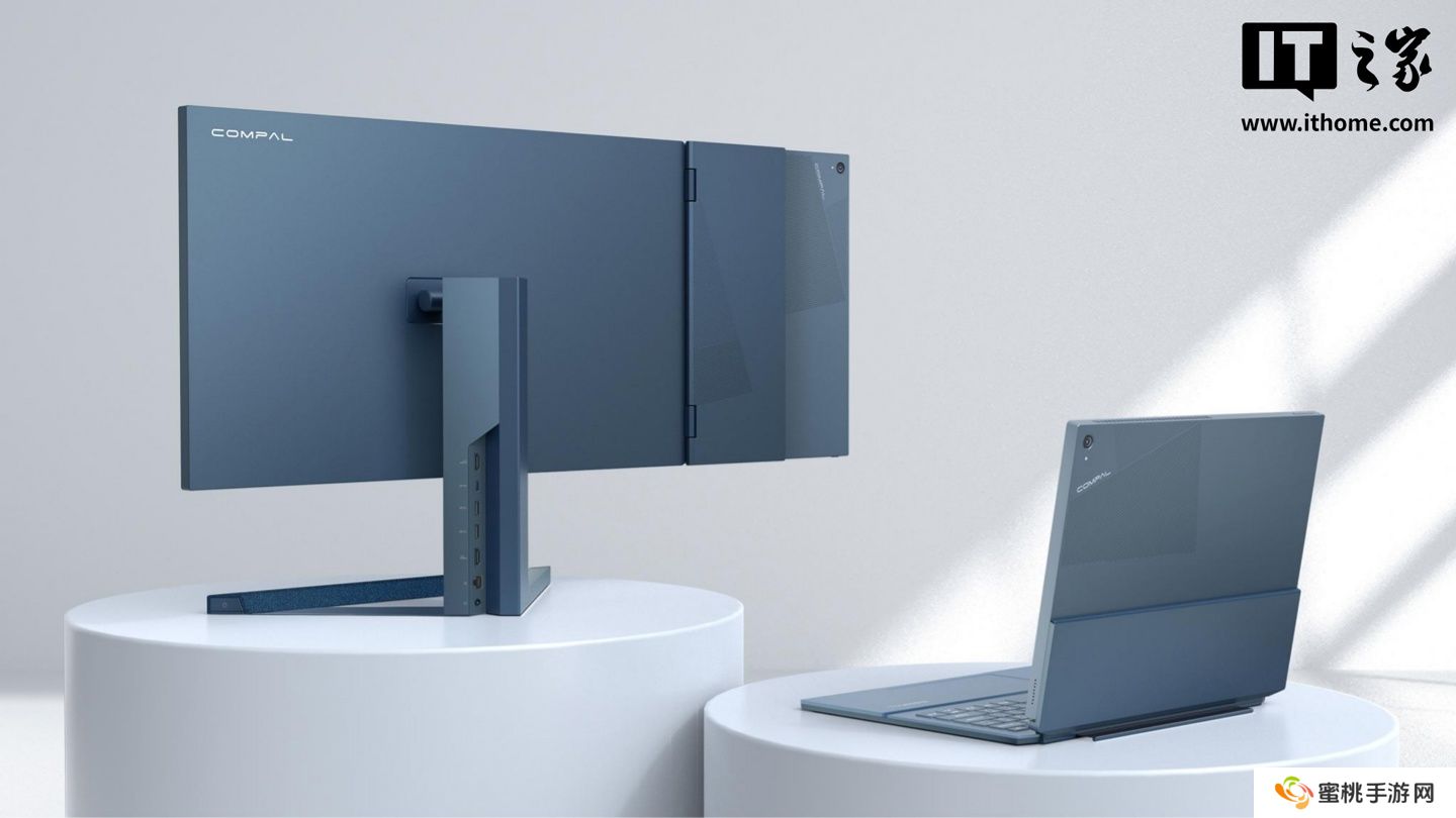 根据仁宝提供的图片可以看到,这款概念产品以一个平板为基体,有一个类似如今各大平板都会有的磁吸外接键盘,还有一个从侧面插入平板的扩展显示器。