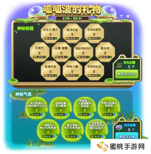 2月19日起至3月31日,参加呱呱波的礼物活动,使用次元古籍和次元宝珠净化神秘祝福和神秘气息,并获得多种强大技能。