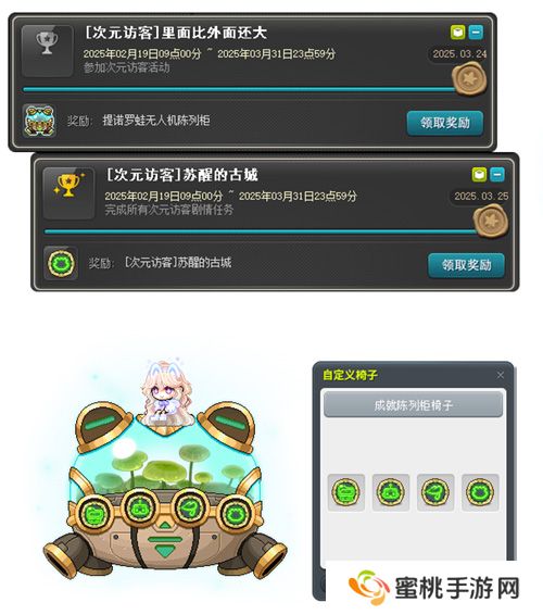 参加次元访客活动,获得成就奖励提诺罗蛙无人机陈列柜,同时完成所有次元访客剧情,可以获得[次元访客]苏醒的古城奖励。完成次元访客其他系列任务,可通过成就奖励获得剩余展示配件。