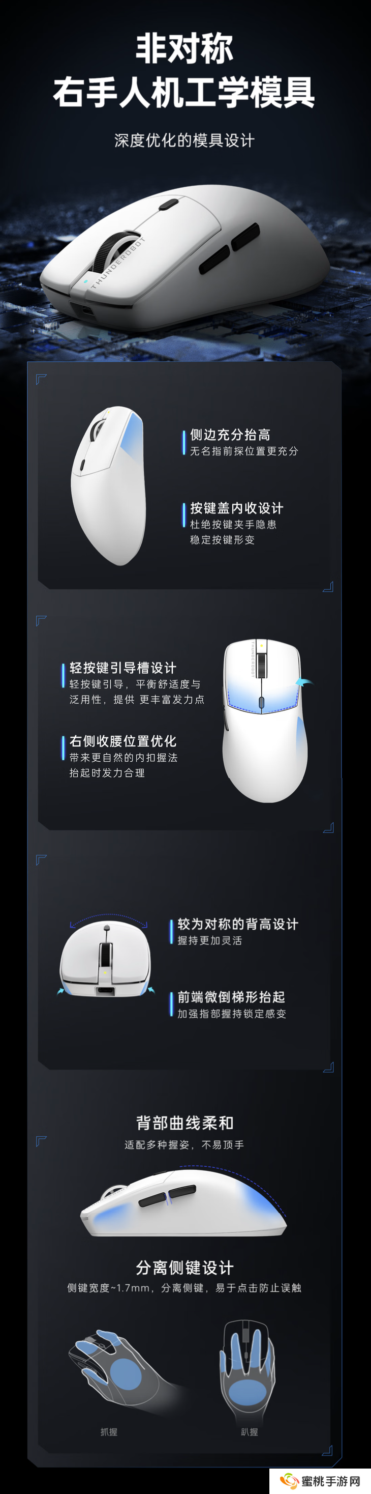 这款鼠标可选黑白双色,整体重量57克,号称引入了非对称右手人体工学模具及“按键辅助回弹系统”,适用于中大手形使用。